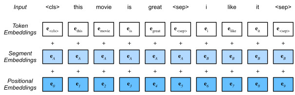 BERT는 두 가지 장점을 결합합니다. 즉, 컨텍스트를 양방향으로 인코딩하고 광범위한 자연어 처리 작업에 대해 최소한의 아키텍처 변경이 필요합니다. - The embeddings of the BERT input sequence are the sum of the token embeddings, segment embeddings, and positional embeddings.