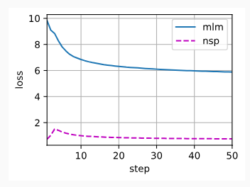 xlim=[1, num_steps], legend=['mlm', 'nsp'])