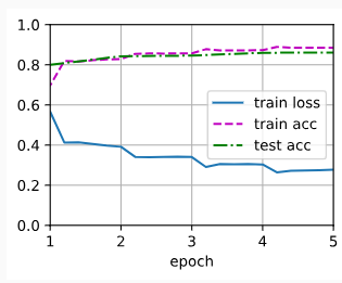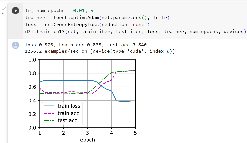 - d2l.train_ch13()은 모델을 학습하는 함수입니다. 해당 함수에 학습에 필요한 정보를 전달하여 학습을 실행합니다.