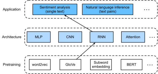 사전 훈련된 단어 벡터는 텍스트 시퀀스의 개별 토큰을 나타낼 수 있습니다. - Bidirectional RNNs can represent a text sequence, such as via the concatenation of its hidden states at the initial and final time steps. This single text representation can be transformed into categories using a fully connected layer.