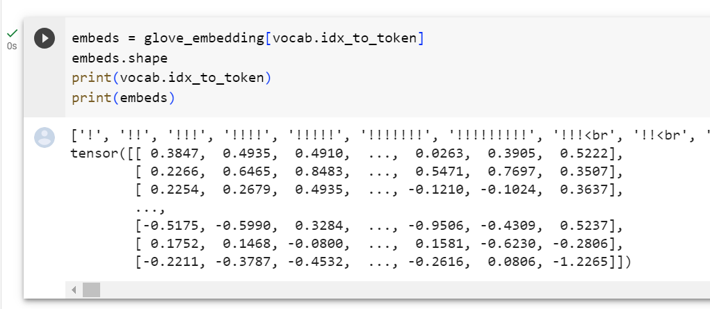 - 입력된 텍스트 시퀀스 'this movie is so great'는 함수 내부에서 어휘 사전을 사용하여 토큰 인덱스로 변환됩니다.
