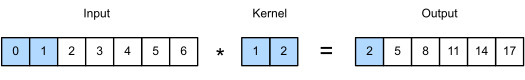 As shown in Fig. 16.3.2, in the one-dimensional case, the convolution window slides from left to right across the input tensor. During sliding, the input subtensor (e.g., 0 and 1 in Fig. 16.3.2) contained in the convolution window at a certain position and the kernel tensor (e.g., 1 and 2 in Fig. 16.3.2) are multiplied elementwise. The sum of these multiplications gives the single scalar value (e.g., 0×1+1×2=2 in Fig. 16.3.2) at the corresponding position of the output tensor.