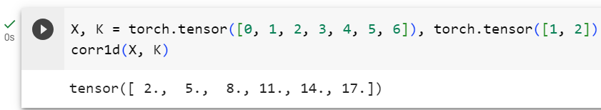 - corr1d(X, K) 함수를 호출하여 주어진 입력 시퀀스 X와 커널 K를 사용하여 1차원 합성곱 연산을 수행합니다.