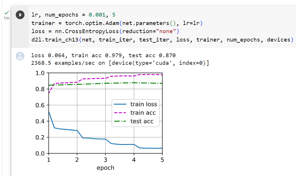 - d2l.train_ch13(net, train_iter, test_iter, loss, trainer, num_epochs, devices): d2l 라이브러리의 train_ch13 함수를 사용하여 모델을 학습합니다. 학습 데이터인 train_iter, 검증 데이터인 test_iter, 손실 함수 loss, 옵티마이저 trainer, 에폭 수 num_epochs, GPU 디바이스 devices 등을 인자로 제공합니다.