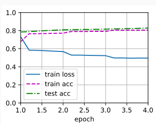 - d2l.train_ch13(net, train_iter, test_iter, loss, trainer, num_epochs, devices): 모델을 훈련하는 함수인 train_ch13를 호출합니다. 이 함수는 주어진 모델(net), 훈련 데이터셋(train_iter), 테스트 데이터셋(test_iter), 손실 함수(loss), 옵티마이저(trainer), 에폭 수(num_epochs), 그리고 디바이스(devices)에 따라 모델을 학습하고 테스트합니다.