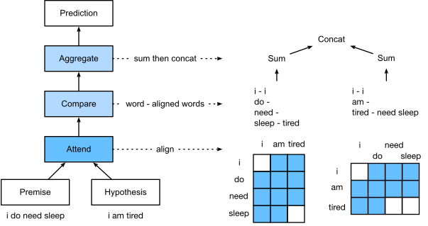 - The decomposable attention model consists of three steps for predicting the logical relationships between premises and hypotheses: attending, comparing, and aggregating.