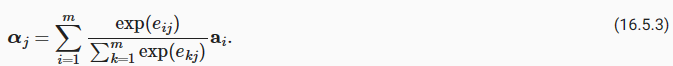 (16.5.1)에서 어텐션 가중치를 정규화하여 가설의 모든 토큰 벡터의 가중 평균을 계산하여 전제에서 i로 인덱스된 토큰과 부드럽게 정렬되는 가설의 표현을 얻습니다.