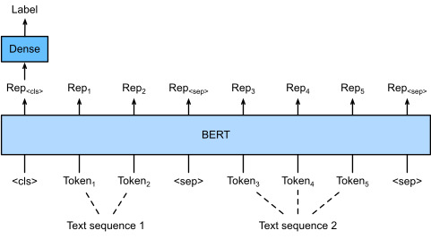 섹션 15.8에서는 BERT의 입력 표현을 설명합니다. BERT 입력 시퀀스는 단일 텍스트와 텍스트 쌍을 모두 명확하게 나타냅니다. 여기서 특수 분류 토큰 "<cls>"는 시퀀스 분류에 사용되고 특수 분류 토큰 "<sep>"은 단일 텍스트의 끝을 표시하거나 텍스트 쌍을 구분합니다. . 그림 16.6.1에서 볼 수 있듯이 단일 텍스트 분류 응용 프로그램에서 특수 분류 토큰 "<cls>"의 BERT 표현은 전체 입력 텍스트 시퀀스의 정보를 인코딩합니다. 입력된 단일 텍스트의 표현으로서 완전히 연결된(조밀한) 레이어로 구성된 작은 MLP에 공급되어 모든 개별 레이블 값의 분포를 출력합니다.