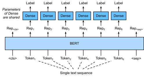 텍스트 태깅 애플리케이션을 위한 BERT 미세 조정은 그림 16.6.3에 설명되어 있습니다. 그림 16.6.1과 비교하면 유일한 차이점은 텍스트 태깅에 있다는 것입니다. 입력 텍스트의 모든 토큰에 대한 BERT 표현은 품사 태그와 같은 토큰의 레이블을 출력하기 위해 동일한 추가 완전히 연결된 레이어에 공급됩니다.