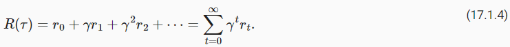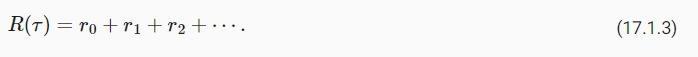 로봇이 목표 위치에 도달하지 못한 채 그리드 세계에서 계속 이동하는 상황을 생각해 보세요. 이 경우 궤도의 상태와 동작의 순서는 무한히 길어질 수 있으며 무한히 긴 궤도의 반환은 무한합니다. 그러한 궤적에 대해서도 강화 학습 공식을 의미 있게 유지하기 위해 할인 계수 γ<1이라는 개념을 도입합니다. 우리는 할인된 수익을 다음과 같이 씁니다.