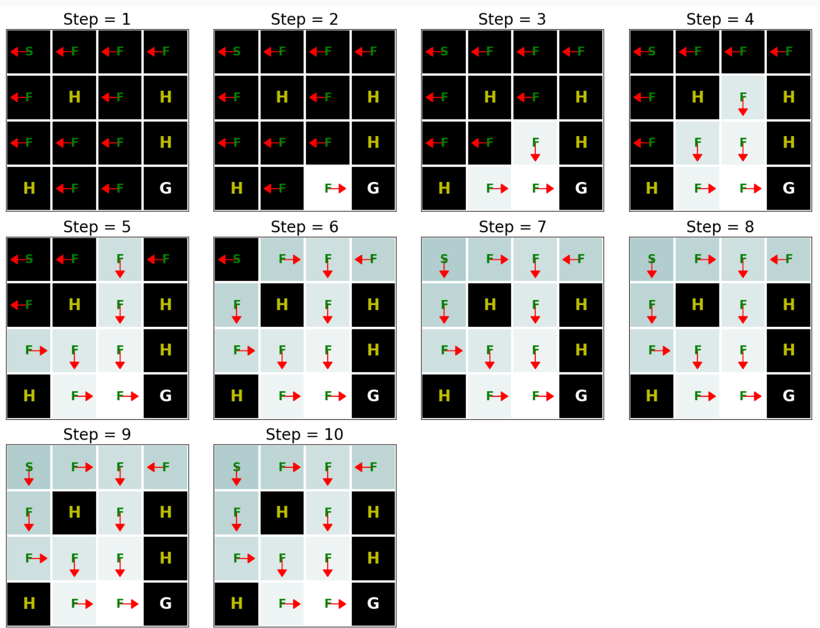 위 그림은 정책(화살표는 동작을 나타냄)과 가치함수(색상 변화는 가치함수가 시간에 따라 어두운 색으로 표시된 초기 값에서 밝은 색으로 표시된 최적의 값으로 어떻게 변화하는지 보여줍니다.)를 보여줍니다. 보시다시피 Value Iteration은 10번의 반복 후에 최적의 가치 함수를 찾고 목표 상태(G)는 H 셀이 아닌 한 어떤 상태에서도 도달할 수 있습니다. 구현의 또 다른 흥미로운 측면은 최적의 가치 함수를 찾는 것 외에도 이 가치 함수에 해당하는 최적의 정책 π*를 자동으로 찾았다는 것입니다.