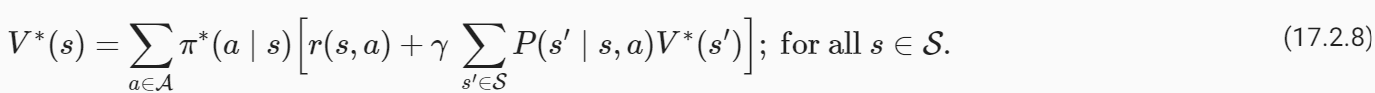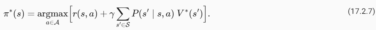이것을 기억하기 위한 좋은 기억법은 상태 s(결정론적 정책에 대한)에서의 최적의 행동은 첫 번째 단계의 보상 r(s,a)의 합과 다음 단계부터 시작하는 궤적의 평균 반환을 최대화하는 행동이라는 것입니다. 상태 s'는 두 번째 단계에서 가능한 모든 다음 상태 s'에 대해 평균을 냅니다.