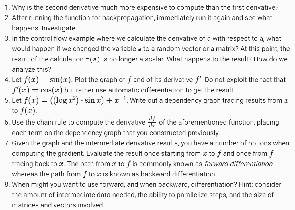 You have now gotten a taste of the power of automatic differentiation. The development of libraries for calculating derivatives both automatically and efficiently has been a massive productivity booster for deep learning practitioners, liberating them so they can focus on less menial. Moreover, autograd lets us design massive models for which pen and paper gradient computations would be prohibitively time consuming. Interestingly, while we use autograd to optimize models (in a statistical sense) the optimization of autograd libraries themselves (in a computational sense) is a rich subject of vital interest to framework designers. Here, tools from compilers and graph manipulation are leveraged to compute results in the most expedient and memory-efficient manner.