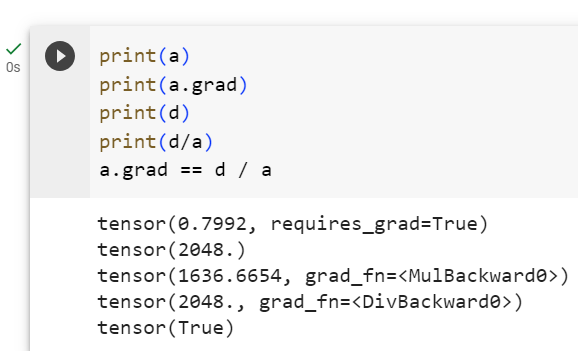 이 비교가 참인 경우, 이는 PyTorch의 자동 미분이 제대로 작동하고 있다는 것을 의미합니다. 즉, d를 a로 미분한 결과가 d / a와 일치한다는 것을 의미합니다.
