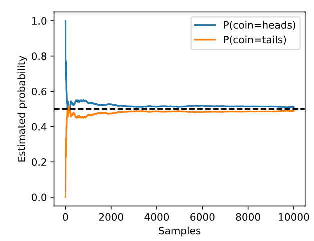 일반적으로 반복되는 사건(예: 동전 던지기)의 평균의 경우 반복 횟수가 증가함에 따라 우리의 추정치는 실제 기본 확률로 수렴됩니다. 이 현상의 수학적 공식을 대수의 법칙이라고 하며 중심 극한 정리는 많은 상황에서 표본 크기 n이 커짐에 따라 이러한 오류가 (1/√n)의 비율로 감소해야 함을 알려줍니다. 던지기 횟수를 1회에서 10,000회까지 증가시키면서 추정치가 어떻게 변화하는지 연구하여 좀 더 직관력을 갖도록 합시다.