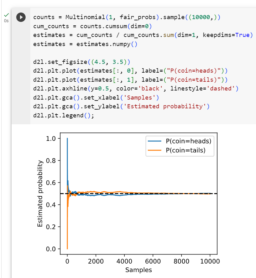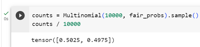 - Multinomial(10000, fair_probs): 이 부분은 Multinomial 분포에서 10,000번의 시행을 수행하여 무작위로 결과를 샘플링합니다. 10,000은 시행 횟수이고, fair_probs는 각 결과(앞면 또는 뒷면)가 나올 확률을 나타내는 확률 분포입니다. 이 부분에서는 10,000번의 독립적인 동전 던지기 시뮬레이션을 수행합니다.