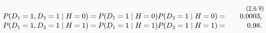 우리의 능력을 시험해 봅시다. 의사가 환자에게 HIV 테스트를 실시한다고 가정합니다. 이 테스트는 매우 정확하며 환자가 건강하지만 질병이 있는 것으로 보고된 경우, 즉 건강한 환자가 1%의 사례에서 양성 반응을 보이는 경우 1% 확률로만 실패합니다. 더욱이, 환자가 실제로 HIV에 감염되어 있는 경우에도 HIV를 탐지하는 데 실패하지 않습니다. D1∈{0,1}을 사용하여 진단(음성인 경우 0, 양성인 경우 1)을 나타내고 H∈{0,1}을 사용하여 HIV 상태를 나타냅니다.