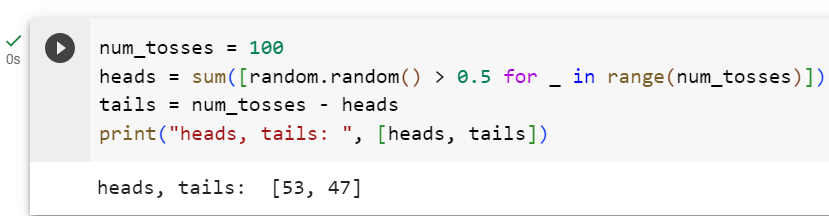heads = sum([random.random() > 0.5 for _ in range(num_tosses)])