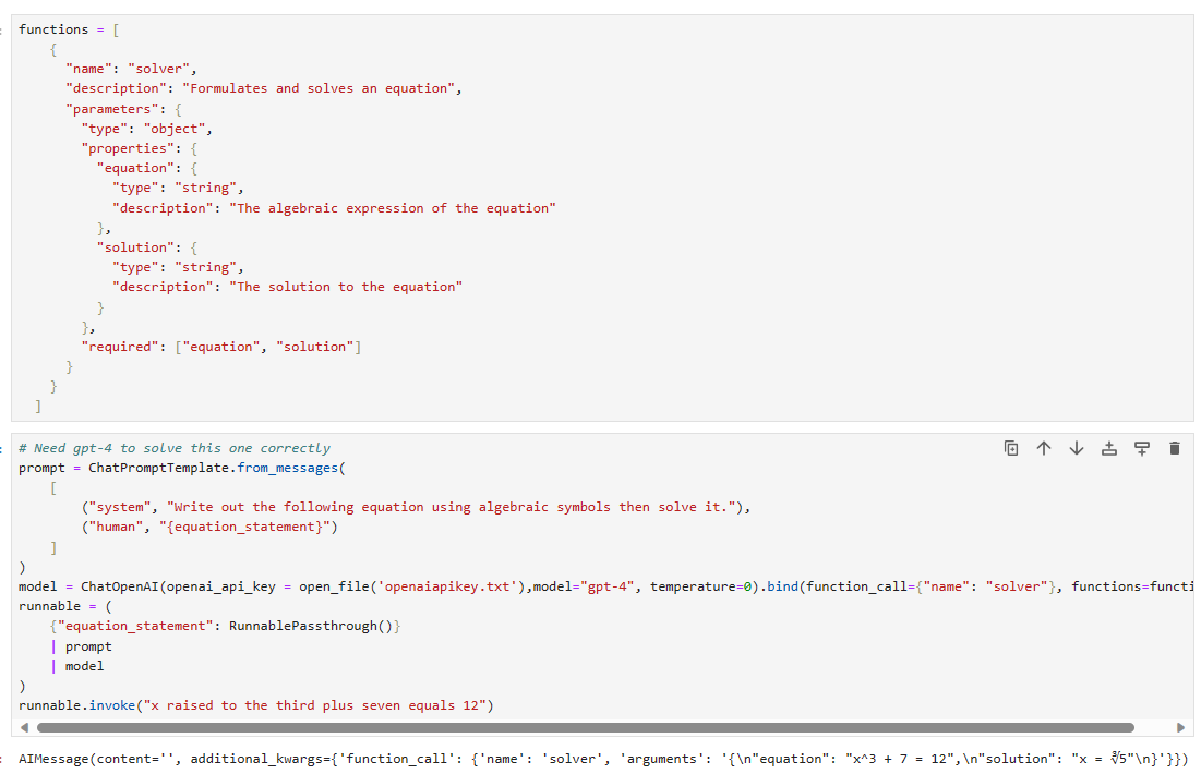 - "model.bind(function_call={"name": "solver"}, functions=functions)"를 사용하여 모델에 함수 호출을 바인딩합니다. "function_call"은 호출할 함수의 이름을 지정하고, "functions"는 함수의 정의를 포함하는 목록입니다. 이 경우, "solver" 함수가 호출될 것입니다.