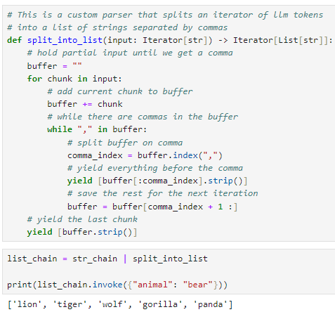 이 코드는 사용자 정의 파서를 정의하고, 이 파서를 사용하여 문자열을 쉼표로 구분된 목록으로 분할하는 예시를 제공합니다.