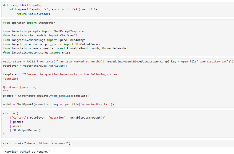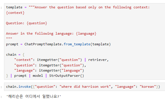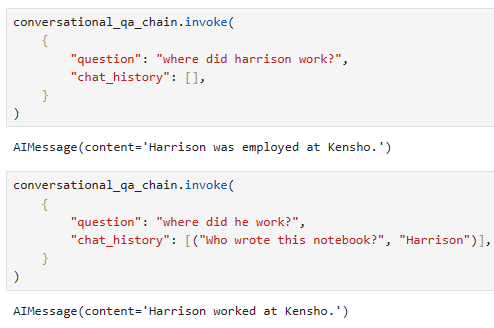 - chain.invoke("where did Harrison work?")를 통해 chain을 호출합니다. 이때 "where did Harrison work?"라는 질문이 대화 체인으로 전달되어, 해당 질문에 대한 정보 검색 대화가 생성되고 처리됩니다.