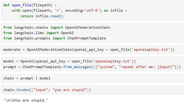 - moderated_chain.invoke({"input": "you are stupid"}): moderated_chain을 사용하여 입력으로 "you are stupid"를 전달합니다. 이때, 입력 문장은 moderate 객체를 거치게 되어 OpenAI 모더레이션 API를 통해 부적절한 내용을 확인합니다. 그런 다음 모델인 chain에서 처리되어 출력을 생성합니다. 만약 OpenAI 모더레이션 API에서 문제가 없는 것으로 확인되면, chain이 해당 입력 문장을 반복 출력할 것입니다.