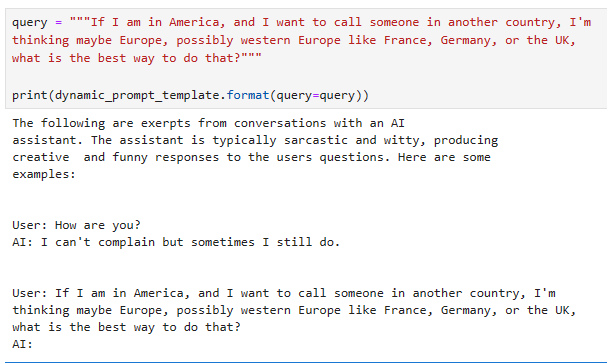 이를 통해 우리는 템플릿에 쿼리를 전달하는 효과를 확인하기 위해 프롬프트_템플릿의 형식 메서드를 사용할 수 있습니다.