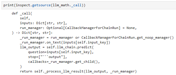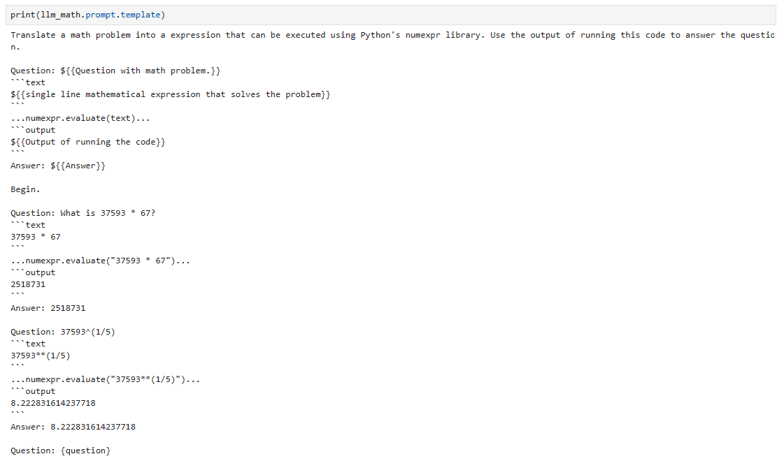 Let's see what is going on here. The chain recieved a question in natural language and sent it to the llm. The llm returned a Python code which the chain compiled to give us an answer. A few questions arise.. How did the llm know that we wanted it to return Python code?