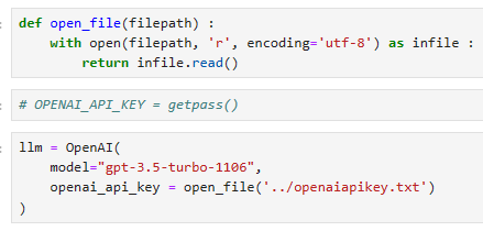내 로컬 코드에서는 getpass() 를 사용하지 않고 외부 파일에 api 키를 저장해 놓고 이 파일을 읽어 오는 방법을 사용했습니다. 그리고 모델을 gpt-3.5-turbo-1106으로 지정했습니다.