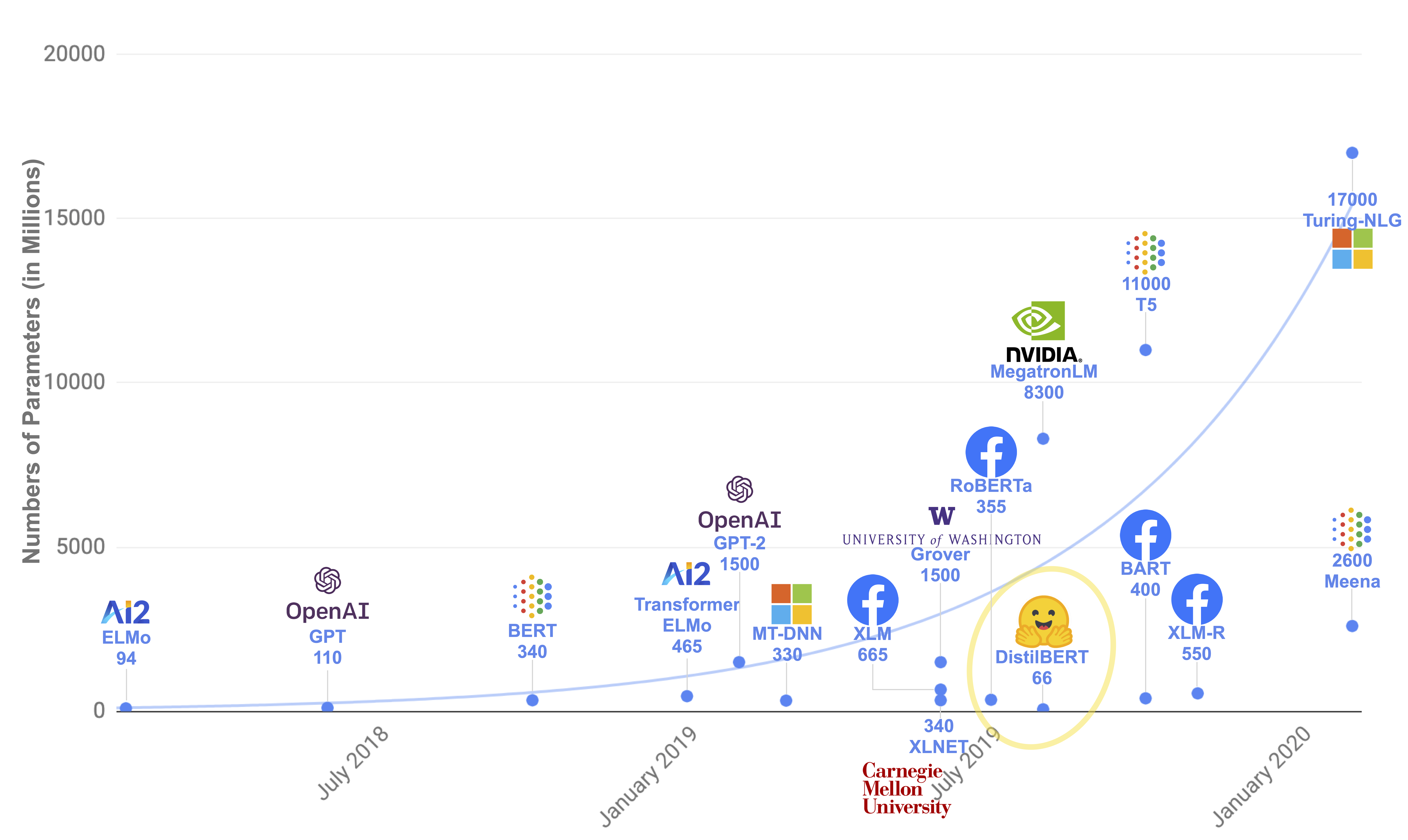 - 2019년 10월: 60% 더 빠르고 메모리는 40% 가벼우면서도 여전히 BERT 성능의 97%를 유지하는 BERT의 증류 버전인 DitilBERT