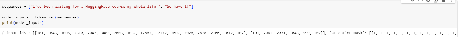 model_inputs = tokenizer(sequences, padding=True, return_tensors="pt")