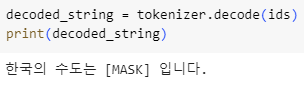 {'score': 0.07277032732963562, 'token': 16809, 'token_str': '대한민국', 'sequence': '한국의 수도는 대한민국 입니다.'},