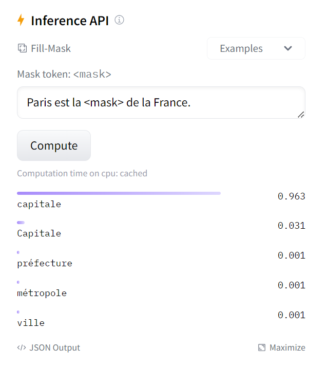 [{'score': 0.9632076025009155, 'token': 2117, 'token_str': 'capitale', 'sequence': 'Paris est la capitale de la France.'}, {'score': 0.031002620235085487, 'token': 22013, 'token_str': 'Capitale', 'sequence': 'Paris est la Capitale de la France.'}, {'score': 0.0011895311763510108, 'token': 10431, 'token_str': 'préfecture', 'sequence': 'Paris est la préfecture de la France.'}, {'score': 0.0006761185941286385, 'token': 8529, 'token_str': 'métropole', 'sequence': 'Paris est la métropole de la France.'}, {'score': 0.0005724380607716739, 'token': 285, 'token_str': 'ville', 'sequence': 'Paris est la ville de la France.'}]
