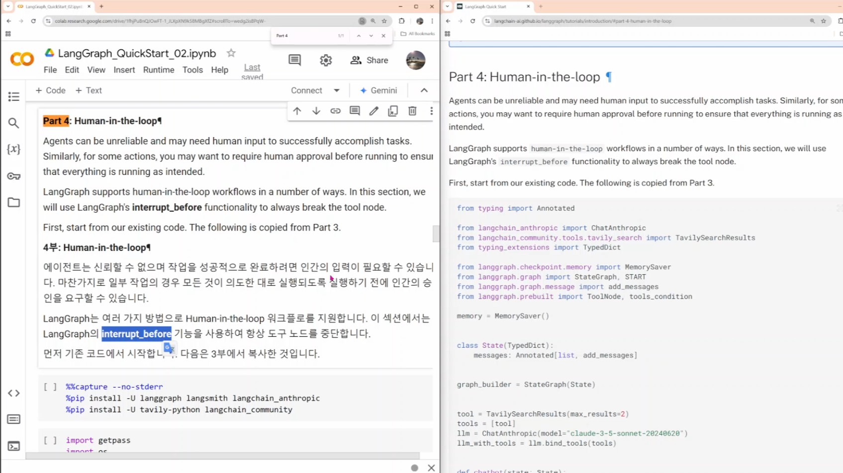 오늘은 LangGraph Quick Start 의 Part 4 Human in the loop 를 공부하고 이어서 다른 다양한 기능을 계속 공부 하겠습니다.