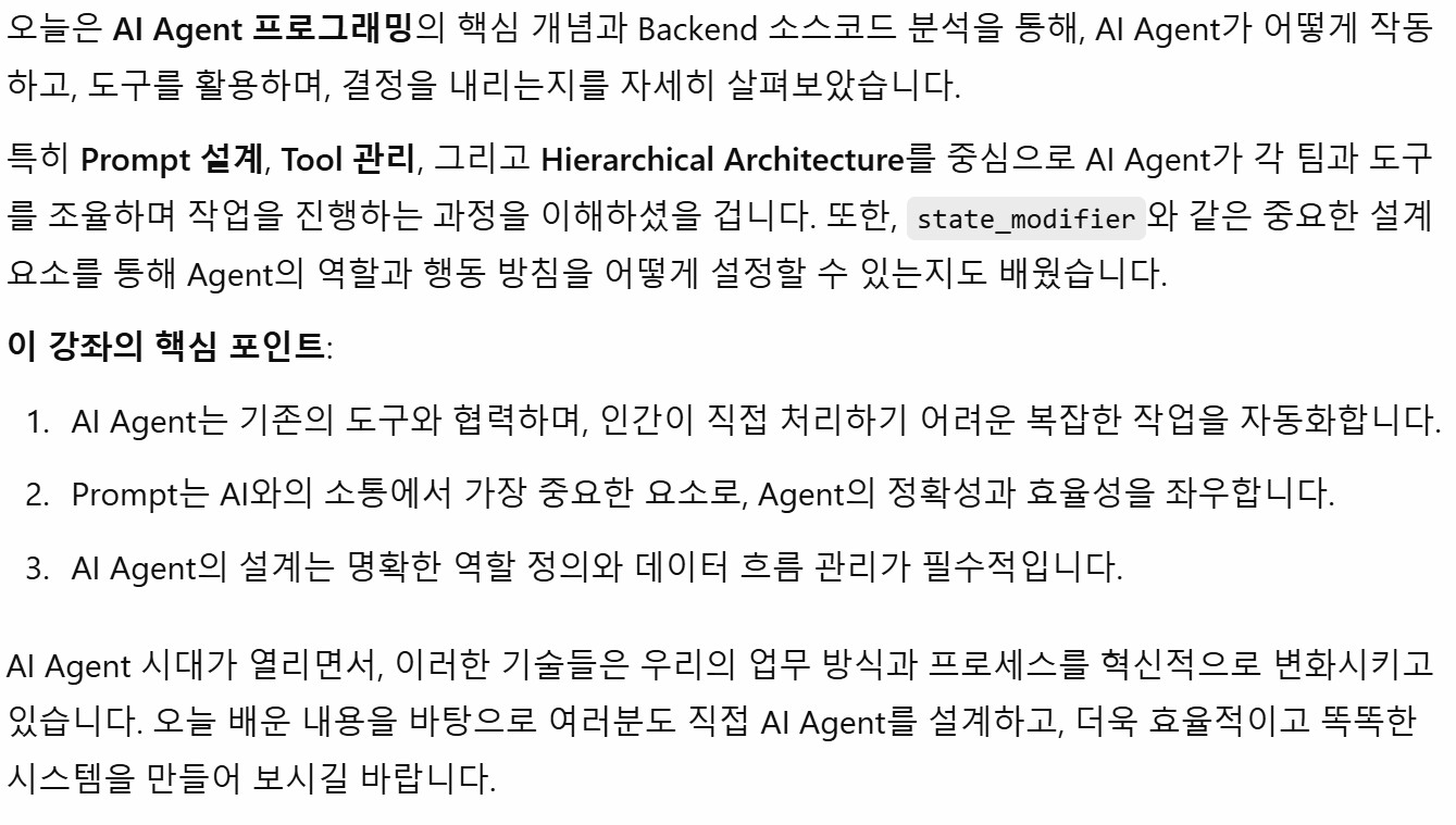 오늘은 Hierarchical Arcitecture를 적용한 AI Agent Web Application 소스코드 분석 마지막 시간 입니다.