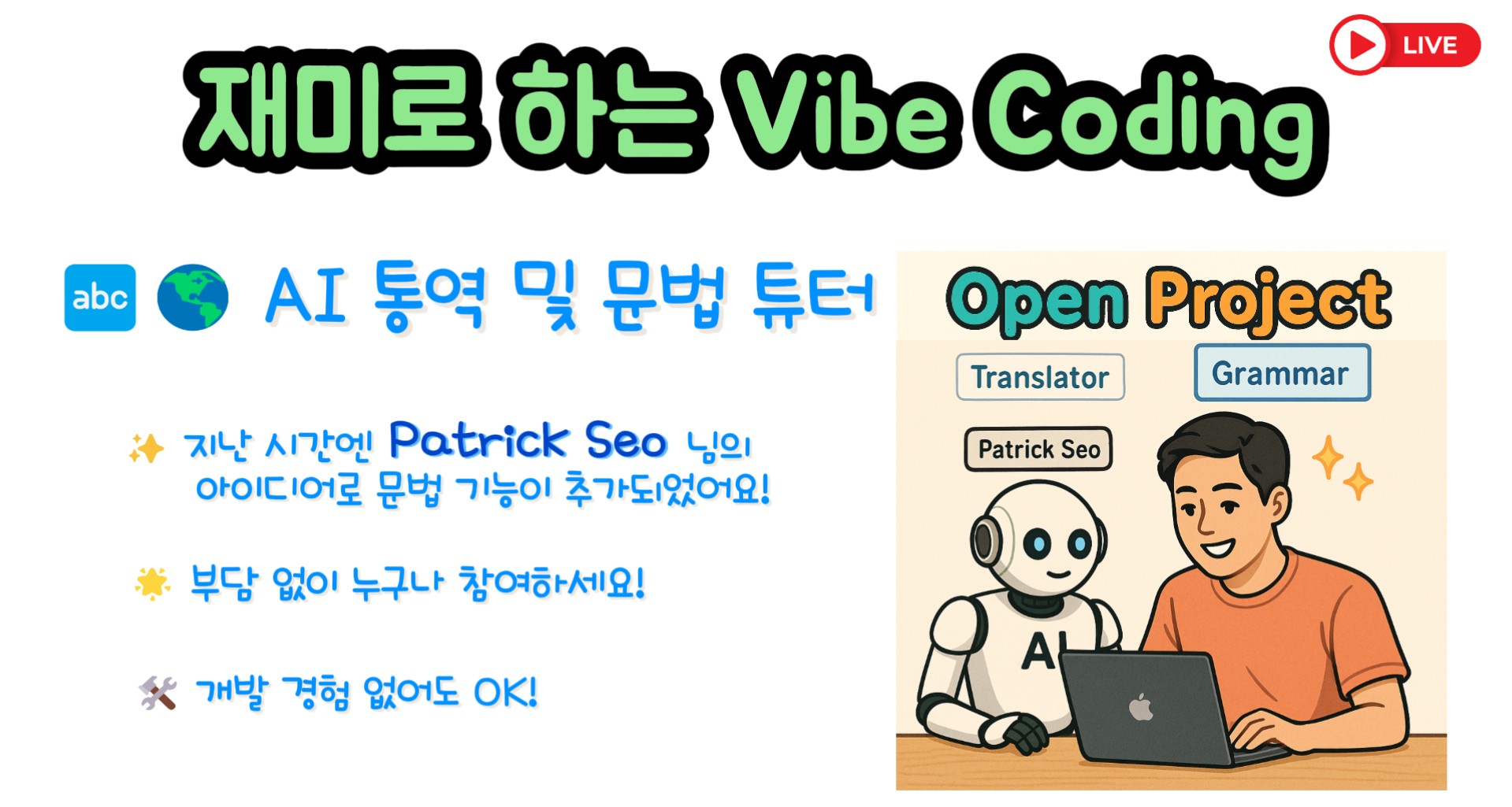 | 📢 [라이브 방송 안내] 재미로 하는 Vibe Coding - Open Project (0) | 2025.05.10 |