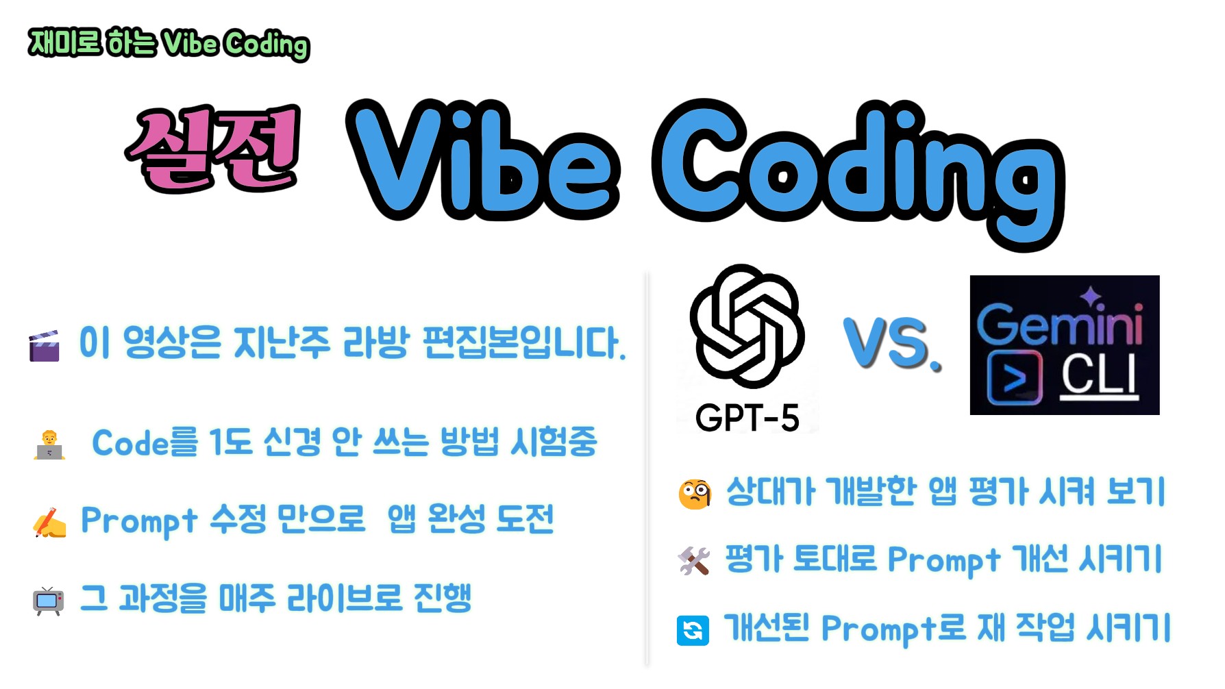 이번주에는 저번 방송에서 GPT-5 와 Gemini CLI 가 개발한 앱을 서로 평가 해 보라고 시켰습니다.