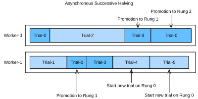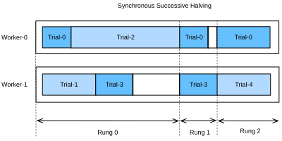 Figure Fig. 19.5.1 shows the scheduling of synchronous SH with η=2 for four different trials with two workers. We start with evaluating Trial-0 and Trial-1 for one epoch and immediately continue with the next two trials once they are finished. We first have to wait until Trial-2 finishes, which takes substantially more time than the other trials, before we can promote the best two trials, i.e., Trial-0 and Trial-3 to the next rung level. This causes idle time for Worker-1. Then, we continue with Rung 1. Also, here Trial-3 takes longer than Trial-0, which leads to an additional ideling time of Worker-0. Once, we reach Rung-2, only the best trial, Trial-0, remains which occupies only one worker. To avoid that Worker-1 idles during that time, most implementaitons of SH continue already with the next round, and start evaluating new trials (e.g Trial-4) on the first rung.