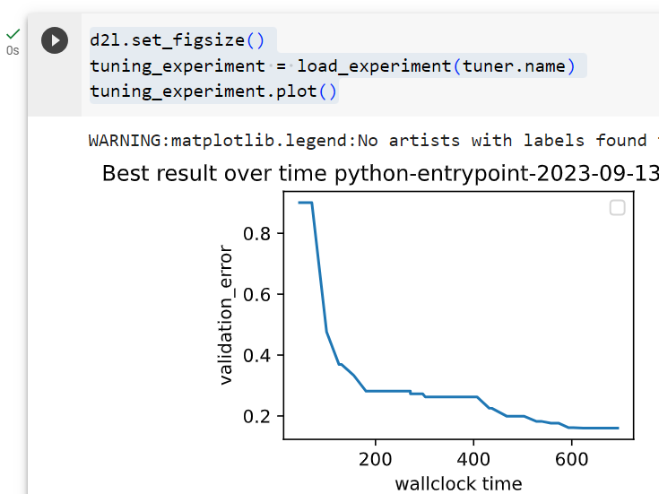 Note that we are running a variant of ASHA where underperforming trials are stopped early. This is different to our implementation in Section 19.4.1, where each training job is started with a fixed max_epochs. In the latter case, a well-performing trial which reaches the full 10 epochs, first needs to train 1, then 2, then 4, then 8 epochs, each time starting from scratch. This type of pause-and-resume scheduling can be implemented efficiently by checkpointing the training state after each epoch, but we avoid this extra complexity here. After the experiment has finished, we can retrieve and plot results.