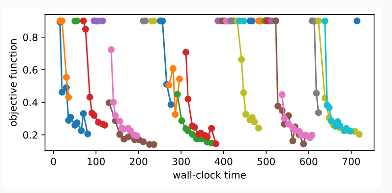 무작위 검색과 비교할 때, 연속적인 반감기는 비동기 분산 설정에서 실행하는 것이 그리 간단하지 않습니다. 동기화 지점을 피하기 위해 우리는 구성을 가능한 한 빨리 다음 단계 수준으로 승격합니다. 이는 잘못된 구성의 승격을 의미하더라도 마찬가지입니다. 실제로 이것은 일반적으로 큰 해를 끼치지 않으며 비동기식 스케줄링과 동기식 스케줄링의 이점은 일반적으로 차선책 의사 결정의 손실보다 훨씬 높습니다.