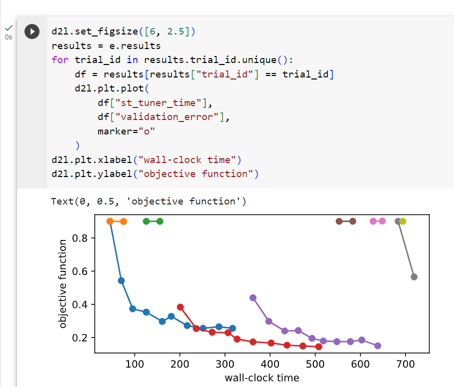 - d2l.plt.plot(...): 선택한 실험 결과 데이터를 그래프로 표시합니다. x 축은 wall-clock time(실행 시간)을, y 축은 objective function(목적 함수) 값을 나타냅니다. marker="o"는 데이터 포인트를 원 형태로 표시하라는 옵션입니다.