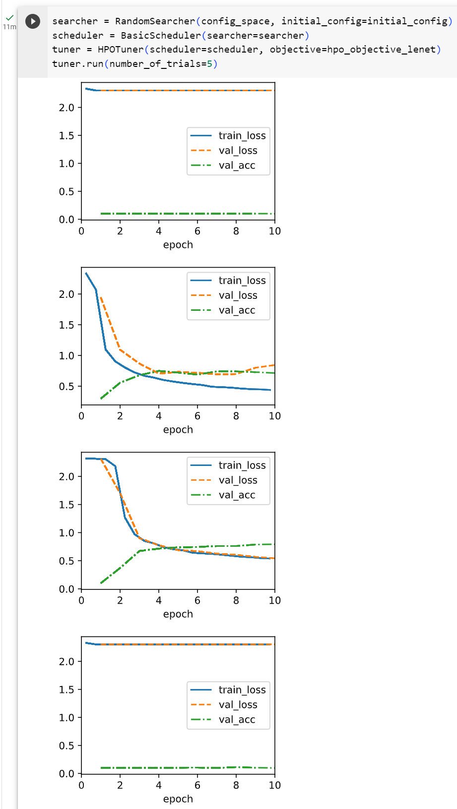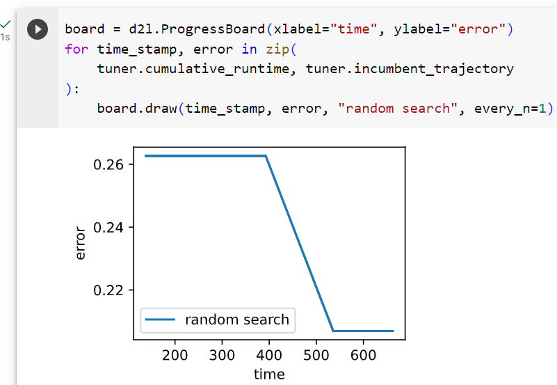 - trainer = d2l.HPOTrainer(max_epochs=1, num_gpus=1): 하이퍼파라미터 최적화를 위한 트레이너를 생성합니다. max_epochs는 1로 설정되어 있으므로 하나의 에포크만 훈련됩니다.