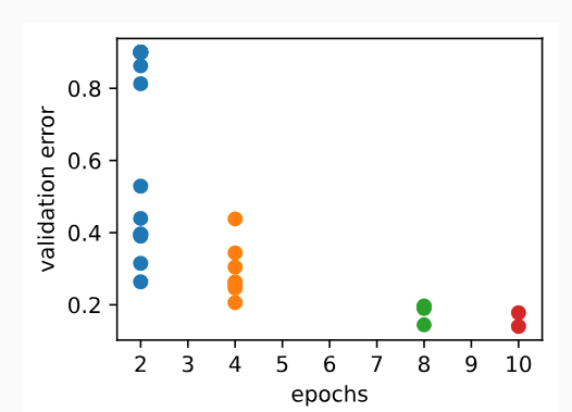 Once more, we visualize the learning curves of every trial (each color in the plot represents a trial). Compare this to asynchronous random search in Section 19.3. As we have seen for successive halving in Section 19.4, most of the trials are stopped at 1 or 2 epochs (r min or η ∗ r min). However, trials do not stop at the same point, because they require different amount of time per epoch. If we ran standard successive halving instead of ASHA, we would need to synchronize our workers, before we can promote configurations to the next rung level.
