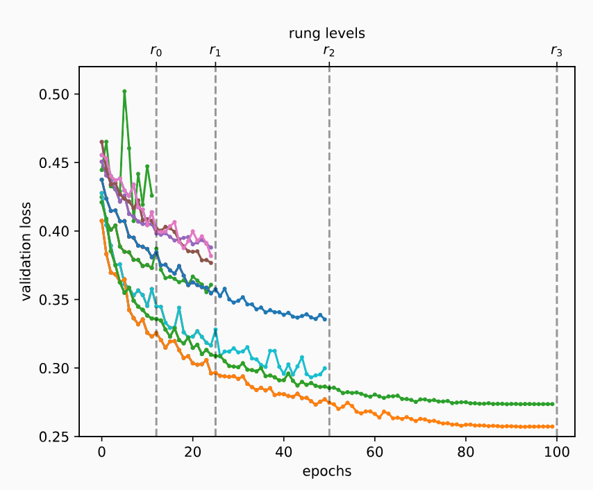- 리소스 할당: 초기에는 모든 파라미터 세트가 작은 리소스를 할당받아 빠르게 평가됩니다. 그런 다음 상위 성능을 보이는 세트가 더 많은 리소스를 할당받게 됩니다.