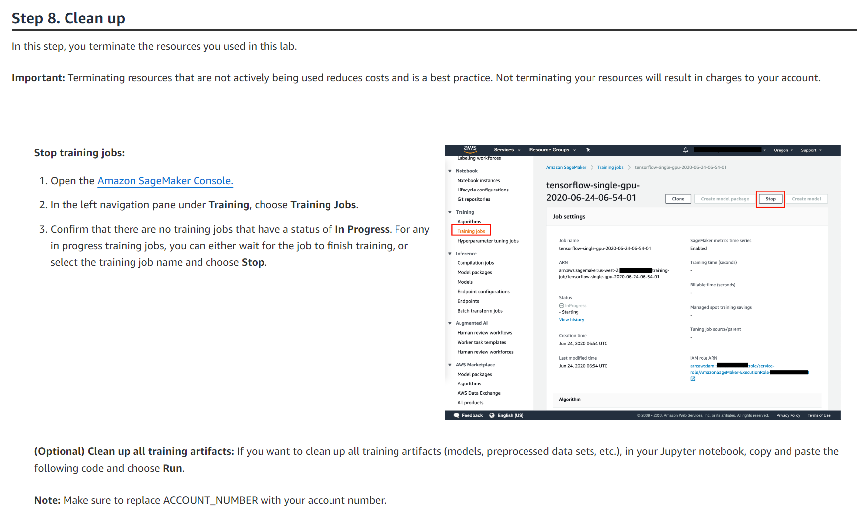 3. 진행 중 상태의 교육 작업이 없는지 확인합니다. 진행 중인 훈련 작업의 경우 작업이 훈련을 마칠 때까지 기다리거나 훈련 작업 이름을 선택하고 중지를 선택할 수 있습니다.