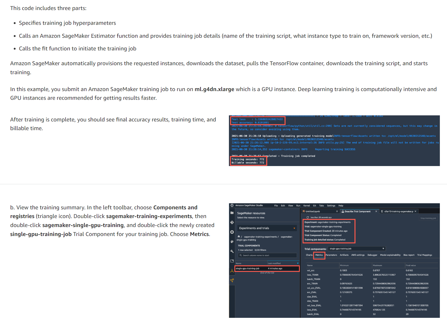 이 예에서는 GPU 인스턴스인 ml.g4dn.xlarge에서 실행할 Amazon SageMaker 훈련 작업을 제출합니다. 딥 러닝 훈련은 계산 집약적이며 결과를 더 빠르게 얻으려면 GPU 인스턴스가 권장됩니다.