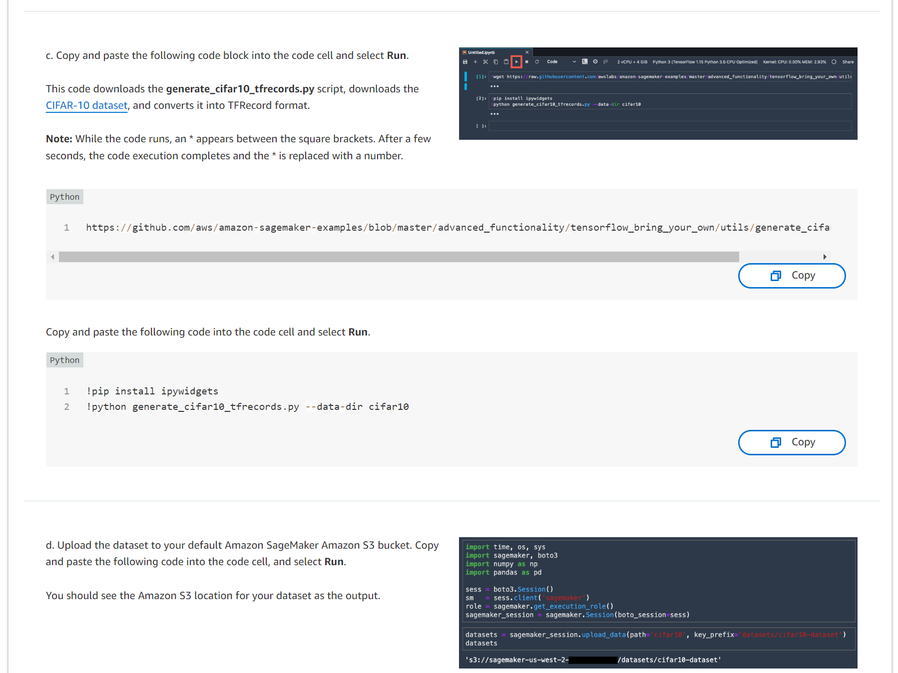 SageMaker 노트북을 생성하고, 데이터 세트를 다운로드하고, 데이터 세트를 TensorFlow 지원 TFRecord 형식으로 변환한 다음 데이터 세트를 Amazon S3에 업로드하려면 다음 단계를 완료하십시오.