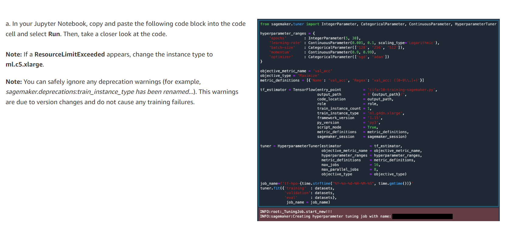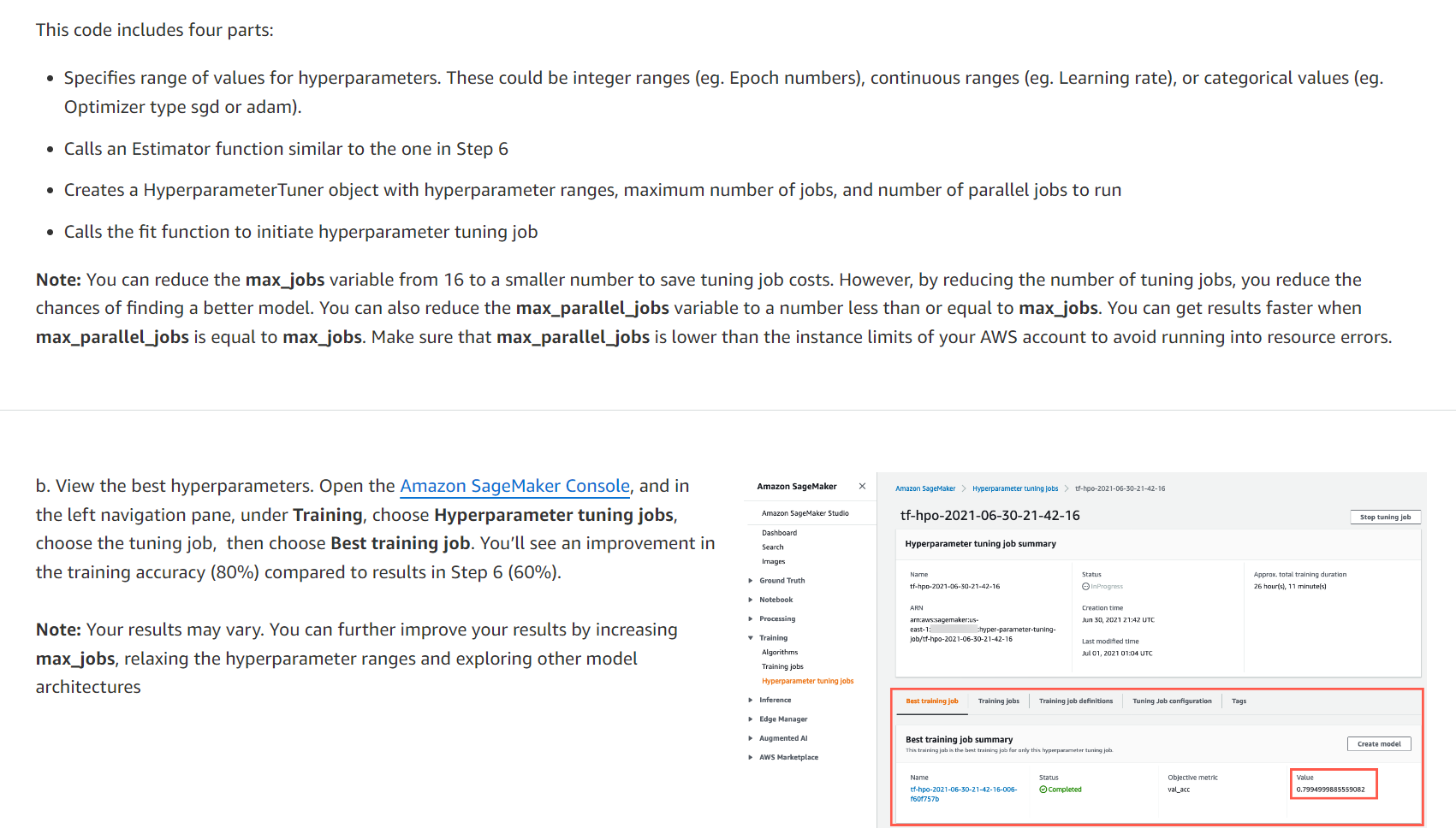이 단계에서는 Amazon SageMaker 자동 모델 튜닝 작업을 실행하여 최상의 하이퍼파라미터를 찾고 6단계에서 얻은 훈련 정확도를 향상시킵니다. 모델 튜닝 작업을 실행하려면 Amazon SageMaker에 고정 값이 아닌 하이퍼파라미터 범위를 제공해야 합니다. 하이퍼파라미터 공간을 탐색하고 자동으로 최적의 값을 찾을 수 있다는 것입니다.