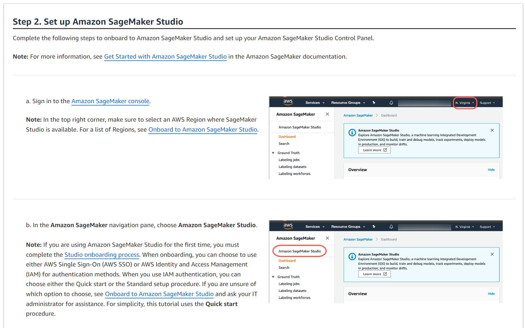 참고: 오른쪽 상단에서 SageMaker Studio를 사용할 수 있는 AWS 리전을 선택하십시오. 지역 목록은 Onboard to Amazon SageMaker Studio 을 참조하십시오.