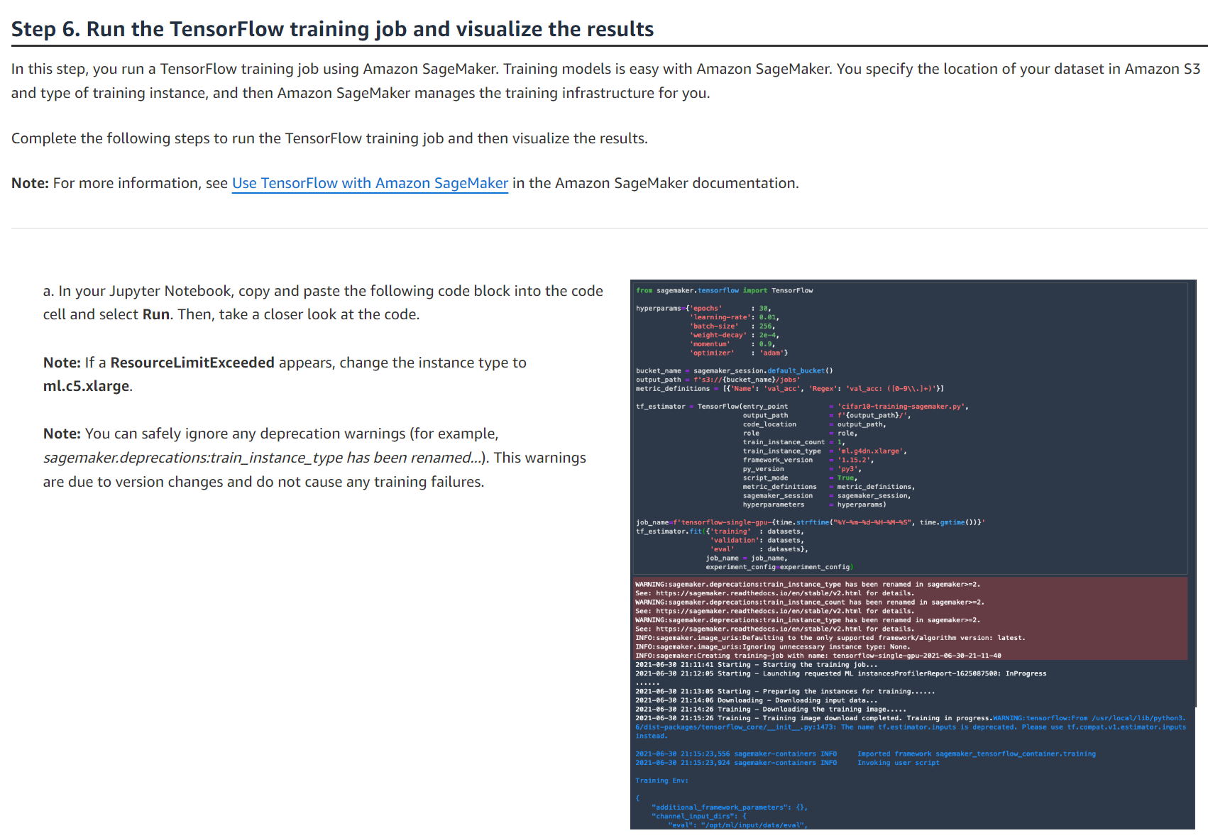 이 단계에서는 Amazon SageMaker를 사용하여 TensorFlow 훈련 작업을 실행합니다. Amazon SageMaker를 사용하면 모델 훈련이 쉽습니다. Amazon S3의 데이터 세트 위치와 훈련 인스턴스 유형을 지정하면 Amazon SageMaker가 훈련 인프라를 관리합니다.